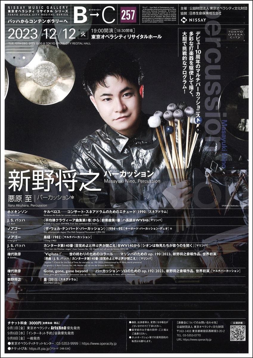 B→C バッハからコンテンポラリーへ 257 新野将之(パーカッション) 23/12/12(火) 東京オペラシティ リサイタルホール シェア ツイート デビュー10周年のマルチ・パーカッショニスト。多彩な打楽器を駆使して描く、大胆で挑戦的なプログラム! 公演情報 ジャンル 器楽 未就学児童は入場不可。 料金 全席自由-3,000円 表示できるチケット情報はありません詳しくはこちら キャスト&スタッフ 出演 新野将之 共演 悪原至 お問い合わせ 東京オペラシティチケットセンター 公式サイト シェア ツイート