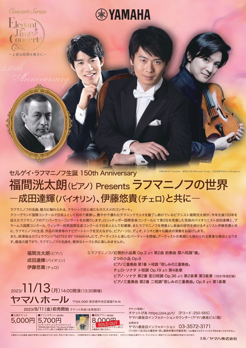 福間洸太朗 Presents ラフマニノフの世界 -成田達輝、伊藤悠貴と共に- 23/11/13(月) ヤマハホール シェア ツイート すべての写真(2)を見る ラフマニノフの名曲、魅力に触れられる、クラシック初心者にもオススメのコンサート。 すべての写真(2)を見る 公演情報 ジャンル 器楽 室内楽 未就学児童は入場不可。 料金 一般-5,000円 ドリンクセット-5,700円 パーティセット-8,000円 表示できるチケット情報はありません詳しくはこちら キャスト&スタッフ ピアノ 福間洸太朗 ヴァイオリン 成田達輝 チェロ 伊藤悠貴 お問い合わせ ヤマハホール 公式サイト シェア ツイート