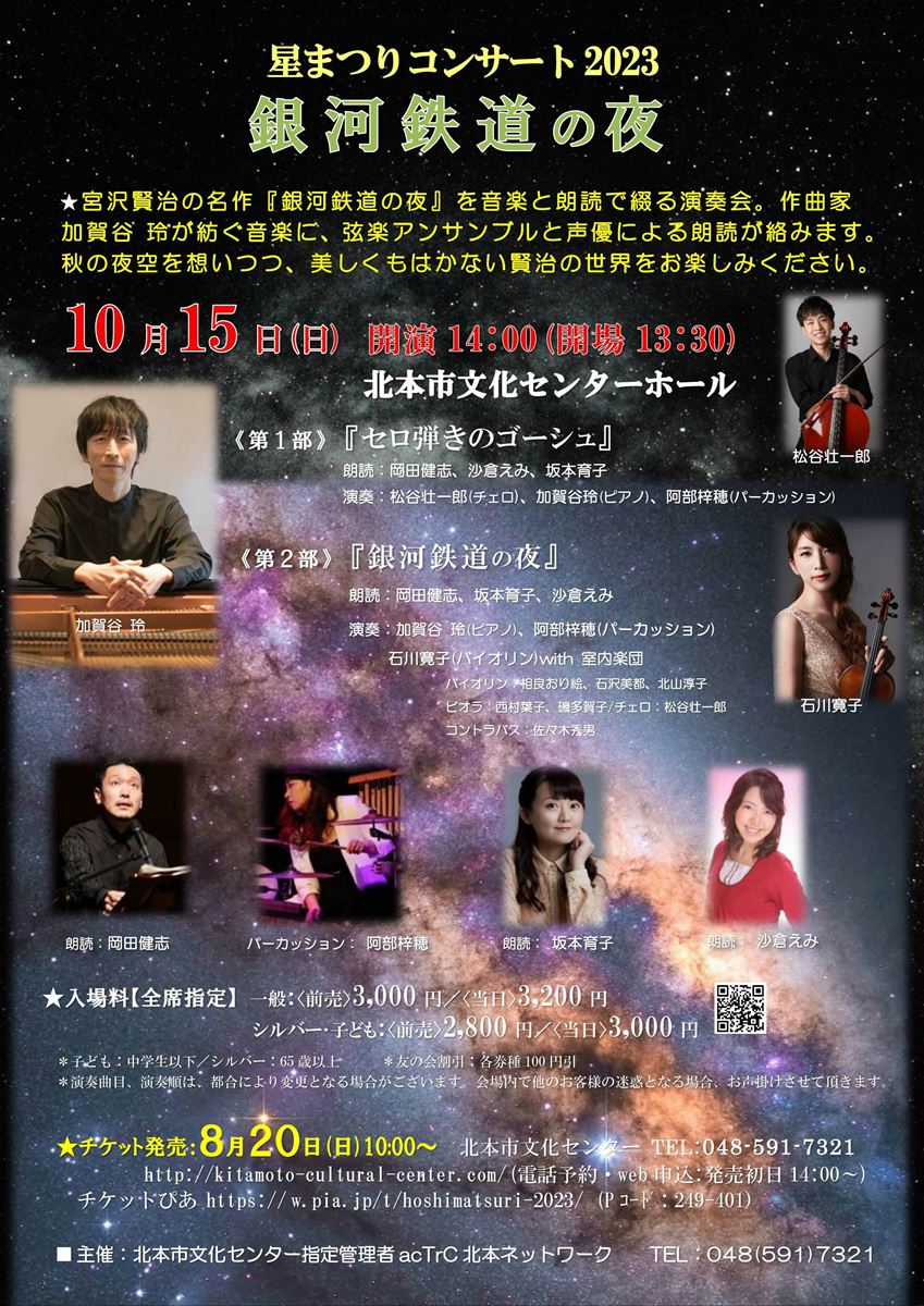 星まつりコンサート2023「銀河鉄道の夜」 23/10/15(日) 北本市文化センター ホール シェア ツイート 宮沢賢治の名作『銀河鉄道の夜』を音楽と朗読で綴る演奏会。作曲家・加賀谷玲が紡ぐ音楽に、弦楽アンサンブルと声優による朗読が絡みます。秋の夜空を想いつつ、美しくもはかない賢治の世界をお楽しみください。 公演情報 ジャンル 器楽 室内楽 ぴあでの販売は<全席指定/前売一般>料金のみとなります。 料金 前売一般-3,000円 表示できるチケット情報はありません詳しくはこちら キャスト&スタッフ 出演 加賀谷玲 阿部梓穂 松谷壮一郎 石川寛子 岡田健志 沙倉えみ 坂本育子 お問い合わせ 北本市文化センター 公式サイト シェア ツイート