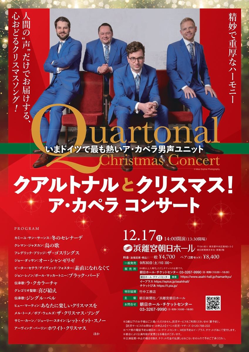 クアルトナルとクリスマス!ア・カペラ コンサート 23/12/17(日) 浜離宮朝日ホール シェア ツイート すべての写真(2)を見る 人間の"声"だけでお届けする、心おどるクリスマスソング!心の芯から温まる聖なるひとときを。 すべての写真(2)を見る 公演情報 ジャンル 声楽 4歳以上は入場可。チケットは1人1枚必要。 料金 全席指定-4,700円 全席指定ペア券-4,200円 全席指定ペア券-1名分/2枚単位での販売 表示できるチケット情報はありません詳しくはこちら キャスト&スタッフ 出演 クアルトナル お問い合わせ 朝日ホール・チケットセンター 公式サイト シェア ツイート