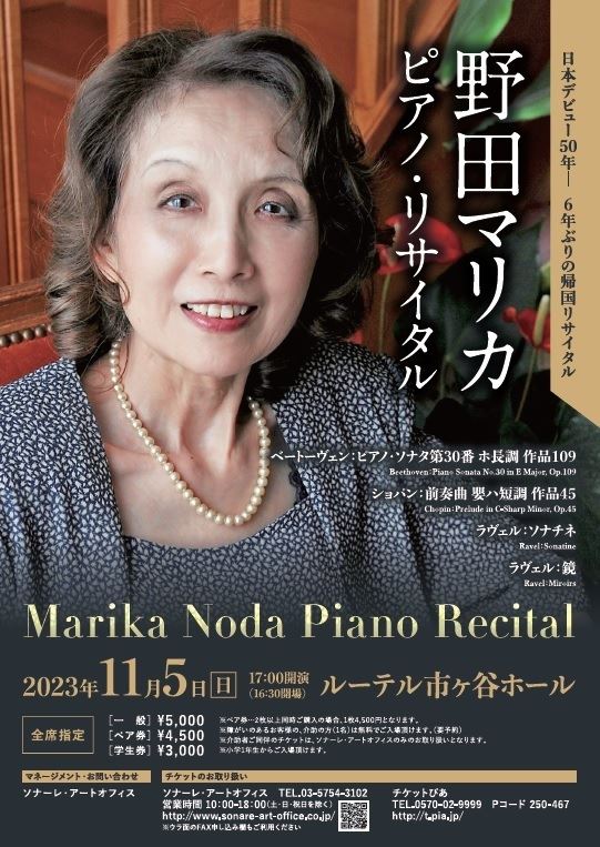 野田マリカ ピアノ・リサイタル 23/11/5(日) ルーテル市ヶ谷ホール シェア ツイート 公演情報 ジャンル ピアノ・鍵盤楽器 ペア券2枚組は2枚単位、ペア券3枚組は3枚単位での販売。 料金 全席指定 一般-5,000円 全席指定 ペア券2枚組-4,500円 全席指定 ペア券3枚組-4,500円 全席指定 学生-3,000円 全席指定 ペア券2枚組-1名分 全席指定 ペア券3枚組-1名分 表示できるチケット情報はありません詳しくはこちら キャスト&スタッフ 出演 野田マリカ お問い合わせ 有限会社ソナーレ・アートオフィス 公式サイト シェア ツイート