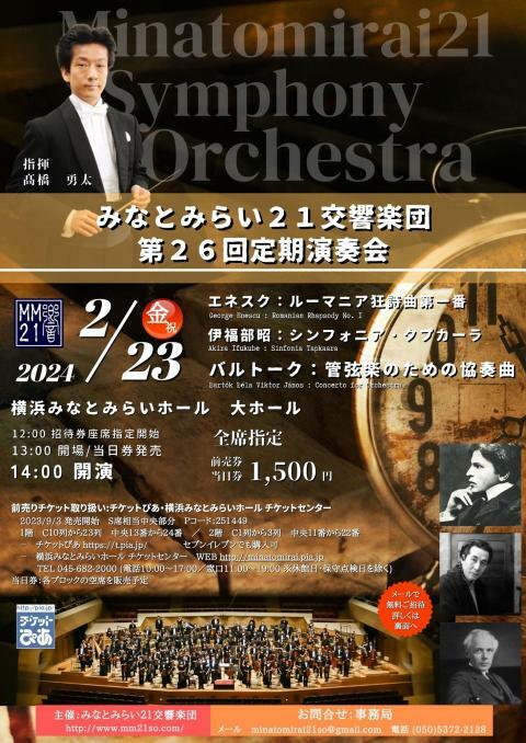 みなとみらい21交響楽団 第26回定期演奏会 24/2/23(金) 横浜みなとみらいホール 大ホール シェア ツイート すべての写真(3)を見る 第26回定期では、バルトークの管弦楽のための協奏曲、伊福部昭のシンフォニア・タプカーラ他に挑戦します すべての写真(3)を見る 公演情報 ジャンル オーケストラ 未就学児童は入場不可。 料金 全席指定-1,500円 表示できるチケット情報はありません詳しくはこちら キャスト&スタッフ 指揮 高橋勇太 出演 みなとみらい21交響楽団 お問い合わせ みなとみらい21交響楽団事務局 公式サイト シェア ツイート