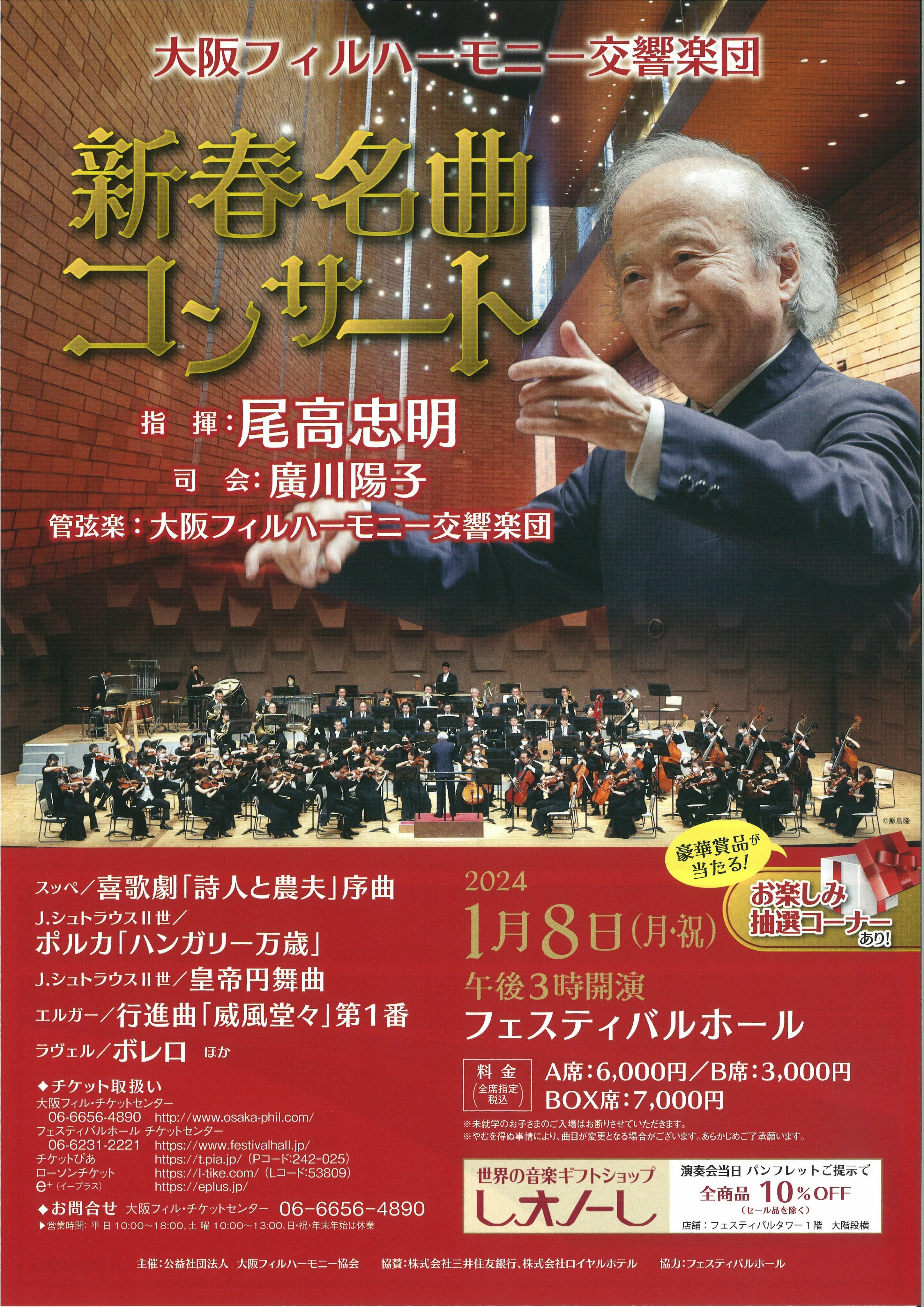 大阪フィルハーモニー交響楽団 新春名曲コンサート 24/1/8(月) フェスティバルホール シェア ツイート 公演情報 ジャンル オーケストラ BOX席は取り扱いなし。未就学児童は入場不可。 料金 A席-6,000円 B席-3,000円 表示できるチケット情報はありません詳しくはこちら キャスト&スタッフ 指揮 尾高忠明 管弦楽 大阪フィルハーモニー交響楽団 お問い合わせ 大阪フィル・チケットセンター 公式サイト シェア ツイート