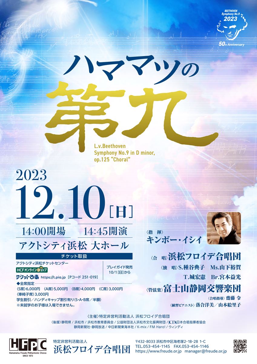 ハママツの第九 演奏会 23/12/10(日) アクトシティ浜松 大ホール シェア ツイート ヨーロッパ仕込みのマエストロがベートーヴェンをどのように表現してくれるでしょう。 公演情報 ジャンル オーケストラ 未就学児のお子さまは入場できません。第九の演奏が始まりますとホール内に入れません。ご注意ください。会場内での写真撮影、録音、録画は固くお断りします。 料金 S席-6,000円 A席-5,000円 B席-4,000円 C席-3,000円 表示できるチケット情報はありません詳しくはこちら キャスト&スタッフ 指揮 キンボー・イシイ 出演 種谷典子 山下裕賀 城宏憲 宮本益光 演奏 富士山静岡交響楽団 合唱 浜松フロイデ合唱団 お問い合わせ 浜松フロイデ合唱団 シェア ツイート
