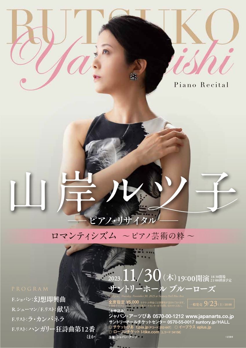 山岸ルツ子 ピアノ・リサイタル 23/11/30(木) サントリーホール ブルーローズ(小ホール) シェア ツイート すべての写真(2)を見る ロマンティシズム ~ピアノ芸術の粋~ すべての写真(2)を見る 公演情報 ジャンル ピアノ・鍵盤楽器 未就学児童は入場不可。 料金 全席指定-5,000円 表示できるチケット情報はありません詳しくはこちら キャスト&スタッフ ピアノ 山岸ルツ子 お問い合わせ ジャパン・アーツぴあ 公式サイト シェア ツイート