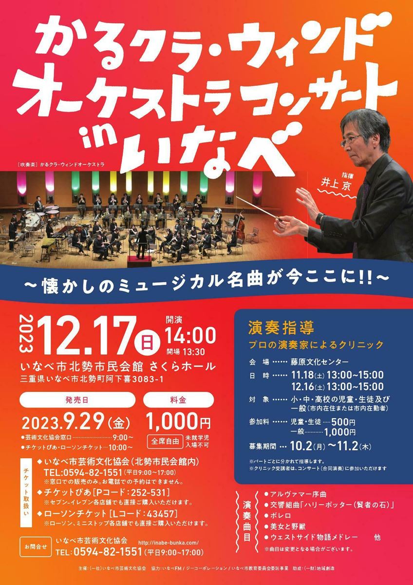 かるクラ・ウィンドオーケストラコンサートinいなべ ~懐かしのミュージカル曲が今ここに!!~ 23/12/17(日) いなべ市北勢市民会館 さくらホール シェア ツイート 公演情報 ジャンル 吹奏楽 未就学児童は入場不可。 料金 全席自由-1,000円 表示できるチケット情報はありません詳しくはこちら お問い合わせ いなべ市芸術文化協会 公式サイト シェア ツイート