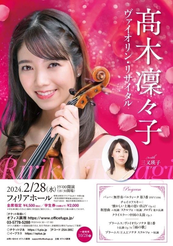 高木凜々子 ヴァイオリン・リサイタル with 三又瑛子 24/2/28(水) 青葉区民文化センター フィリアホール シェア ツイート 公演情報 ジャンル 器楽 未就学児童は入場不可。ご来場の際、ホール内ではマスクの着用にご協力をお願いいたします。車椅子での来場はチケット購入前問合せ先まで要連絡。 料金 全席指定 一般-4,500円 全席指定 学生(18歳以下)-2,000円 全席指定 学生(18歳以下)-公演当日要身分証明書 表示できるチケット情報はありません詳しくはこちら キャスト&スタッフ 出演 高木凜々子 共演 三又瑛子 シェア ツイート