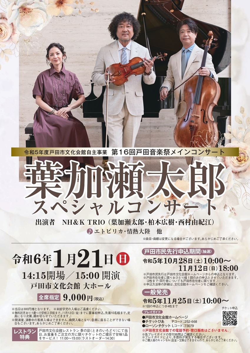 葉加瀬太郎スペシャルコンサート 24/1/21(日) 戸田市文化会館 シェア ツイート すべての写真(2)を見る 第16回戸田音楽祭メインコンサート すべての写真(2)を見る 公演情報 ジャンル 器楽 室内楽 料金 全席指定 一般-9,000円 表示できるチケット情報はありません詳しくはこちら キャスト&スタッフ 出演 葉加瀬太郎 西村由紀江 柏木広樹 お問い合わせ 戸田市文化会館 公式サイト シェア ツイート