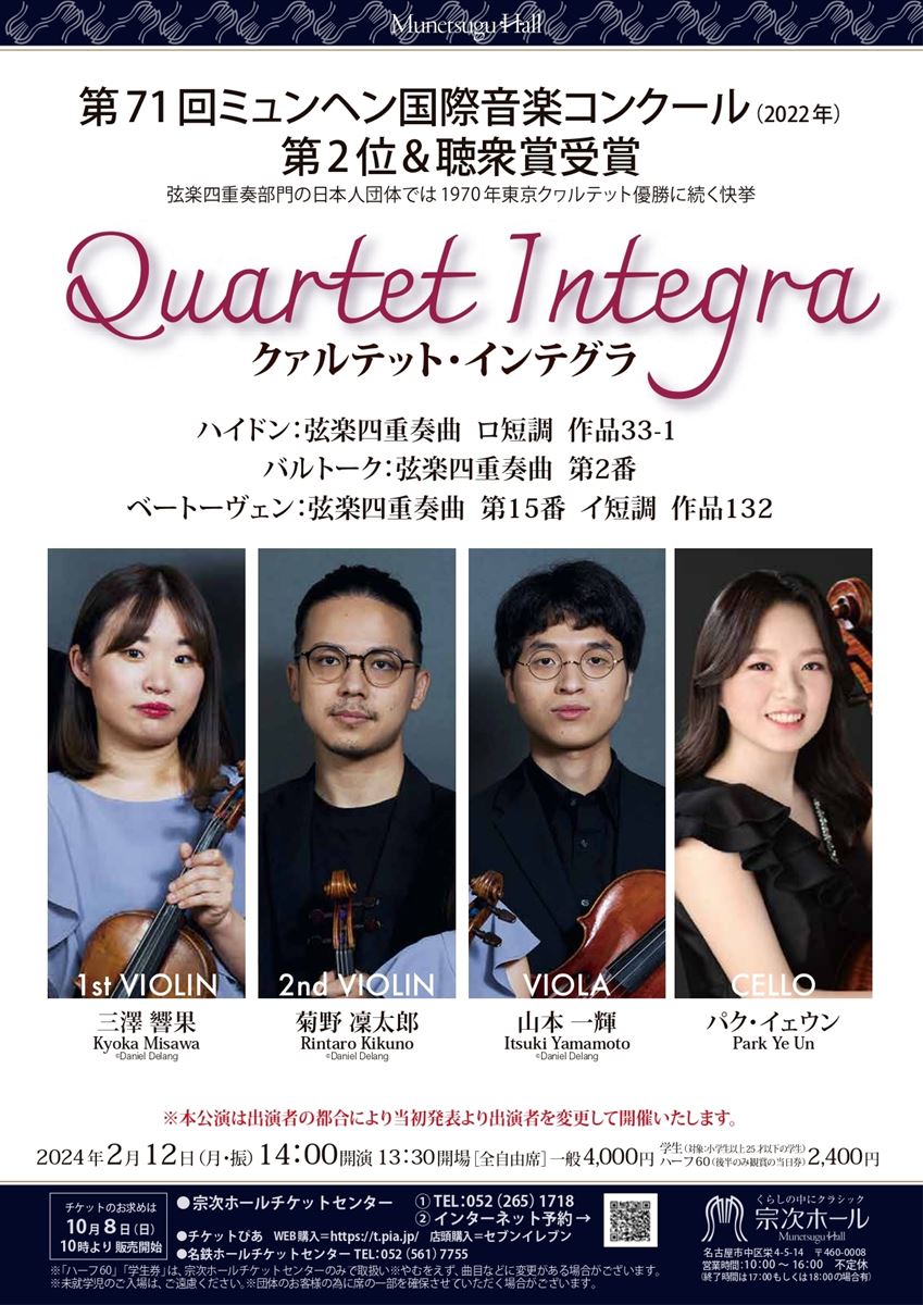 【変更後】出演:三澤響果(1stヴァイオリン)菊野凜太郎(2ndヴァイオリン)山本一輝(ヴィオラ)パク・イェウン(チェロ)