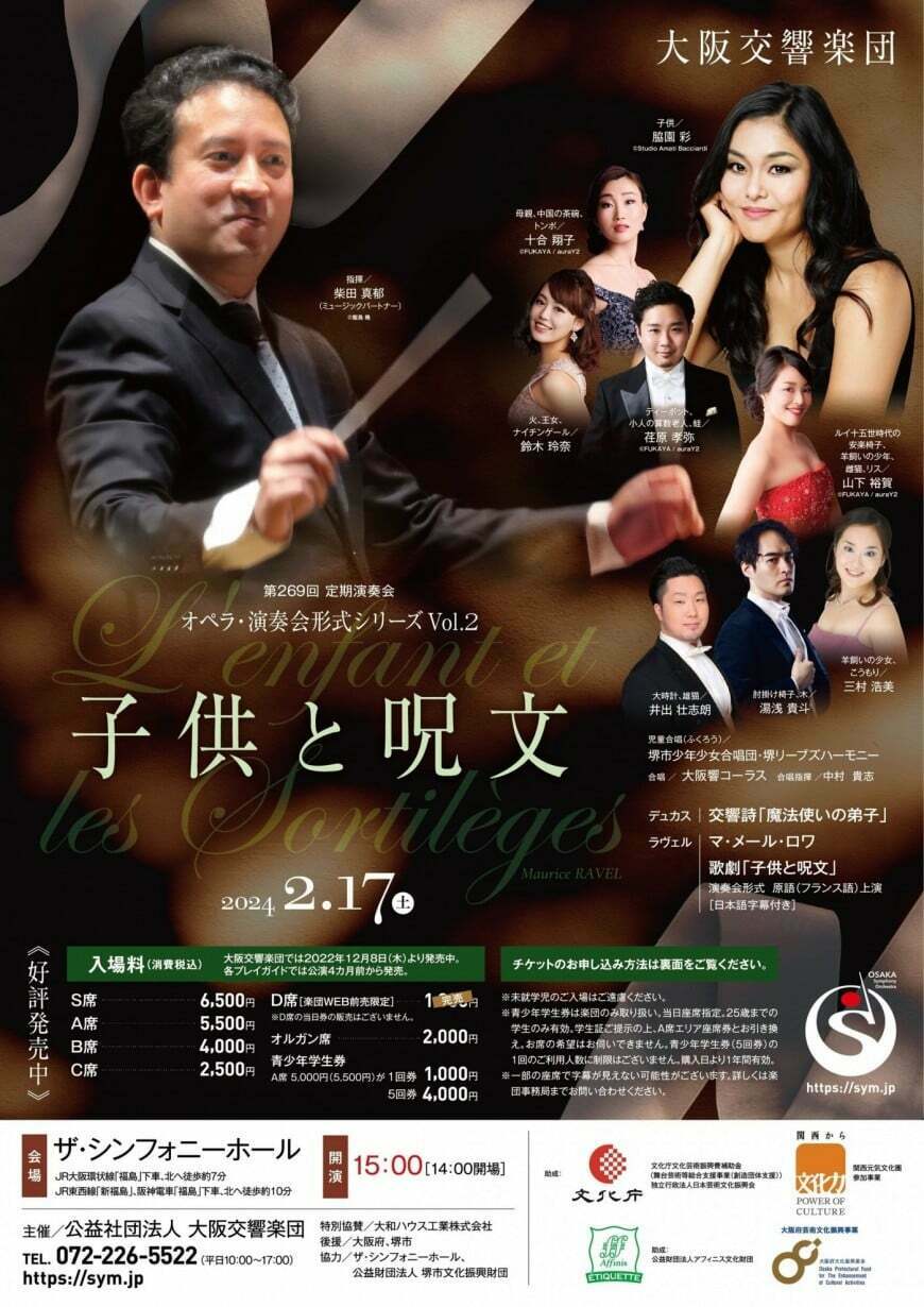 大阪交響楽団 第269回定期演奏会 24/2/17(土) ザ・シンフォニーホール シェア ツイート オペラ・演奏会形式シリーズ Vol.2 “子供と呪文” 公演情報 ジャンル オーケストラ D席、青少年学生券は取り扱いなし。未就学児童は入場不可。一部の座席で字幕が見えない可能性がございます。予めご了承ください。 料金 S席-6,500円 A席-5,500円 B席-4,000円 C席-2,500円 オルガン席-2,000円 表示できるチケット情報はありません詳しくはこちら キャスト&スタッフ 指揮 柴田真郁 メゾソプラノ 脇園彩 十合翔子 山下裕賀 ソプラノ 鈴木玲奈 三村浩美 テノール 荏原孝弥 バリトン 井出壮志朗 バス 湯浅貴斗 合唱指揮 中村貴志 管弦楽 大阪交響楽団 合唱 堺市少年少女合唱団 堺リーブズハーモニー 大阪響コーラス お問い合わせ 大阪交響楽団 シェア ツイート