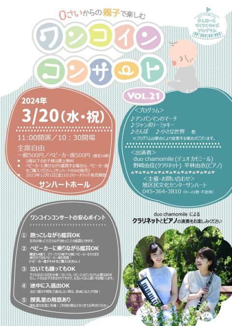 0さいからの親子で楽しむワンコインコンサートVol.21 24/3/20(水) 横浜市旭区民文化センター(サンハート) ホール シェア ツイート 0歳から親子で楽しむコンサート 公演情報 ジャンル 器楽 室内楽 ※2歳以下は膝上無料 ※ベビーカー席(限定14席)ご希望の場合はお電話でご購入下さい。 料金 全席自由-500円 表示できるチケット情報はありません詳しくはこちら お問い合わせ 横浜市旭区民文化センターサンハート シェア ツイート