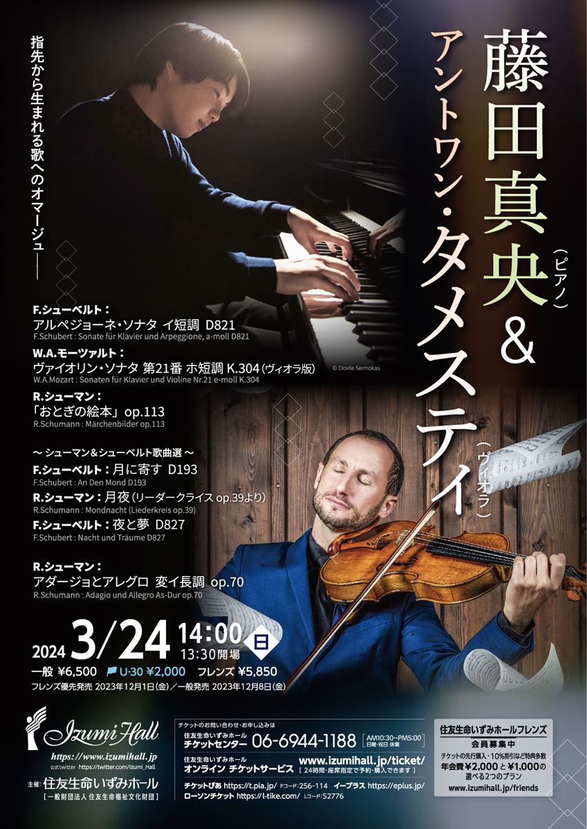 藤田真央(p)&アントワン・タメスティ(va) 24/3/24(日) 住友生命いずみホール シェア ツイート 公演情報 ジャンル 器楽 ピアノ・鍵盤楽器 U-30、ユースシートは取り扱いなし。未就学児童は入場不可。 料金 一般-6,500円 一般-指定 表示できるチケット情報はありません詳しくはこちら キャスト&スタッフ ピアノ 藤田真央 ヴィオラ アントワーヌ・タメスティ お問い合わせ いずみホールチケットセンター 公式サイト シェア ツイート