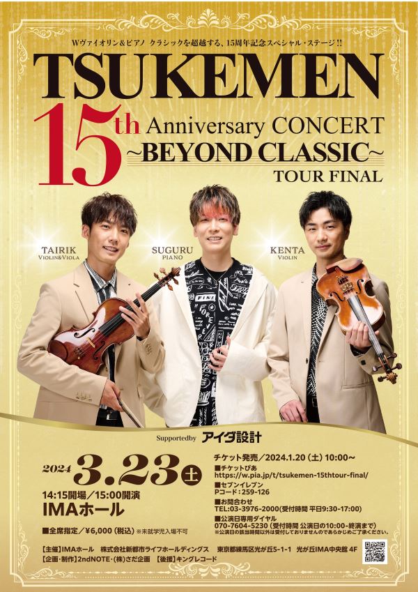 TSUKEMEN 15th Anniversary CONCERT ~BEYOND CLASSIC~ TOUR FINAL 24/3/23(土) 光が丘IMAホール シェア ツイート 全国38公演開催の15周年記念ツアーのファイナル!!“ BEYOND CLASSIC (クラシックを超えて) " TSUKEMEN流 “時短クラシック” からオリジナルまで、迫力と感動の生演奏をお届けします! 公演情報 ジャンル 器楽 室内楽 未就学児入場不可。 料金 全席指定-6,000円 表示できるチケット情報はありません詳しくはこちら キャスト&スタッフ 出演 TSUKEMEN お問い合わせ IMAホール 公式サイト シェア ツイート