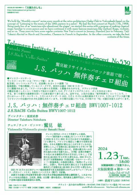 日本テレマン協会 第539回マンスリーコンサート 鷲見敏チェロ 24/1/23(火) 大阪倶楽部4Fホール シェア ツイート 鷲見 敏リサイタル J.S.バッハ:無伴奏チェロ組曲 BWV1007-1012 公演情報 ジャンル 器楽 料金 自由席 一般-3,000円 自由席 U-25-1,000円 表示できるチケット情報はありません詳しくはこちら キャスト&スタッフ 出演 鷲見敏 お問い合わせ 日本テレマン協会(平日10:00~18:00) シェア ツイート