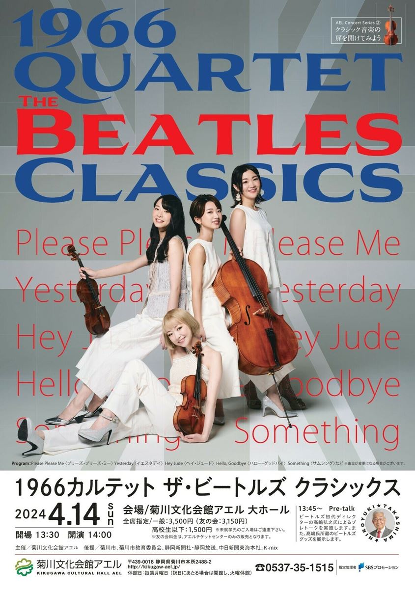 1966カルテット ザ・ビートルズ クラシックス 24/4/14(日) 菊川文化会館アエル 大ホール シェア ツイート 「1966 カルテット」による弦楽器とピアノ演奏でザ・ビートルズナンバーをお楽しみください。 公演情報 ジャンル 器楽 室内楽 未就学児童は入場不可。 料金 全席指定 一般-3,500円 全席指定 高校生以下-1,500円 表示できるチケット情報はありません詳しくはこちら キャスト&スタッフ 出演 1966カルテット お問い合わせ 菊川文化会館アエル 公式サイト シェア ツイート