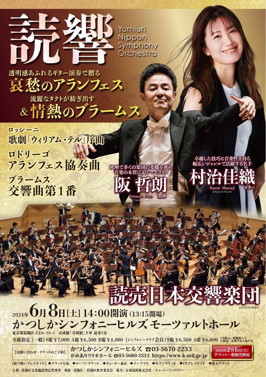 読売日本交響楽団《アランフェス&ブラームス1番》 阪哲朗×村治佳織 24/6/8(土) かつしかシンフォニーヒルズ モーツァルトホール シェア ツイート ロッシーニ:歌劇「ウィリアム・テル」序曲/ロドリーゴ:アランフェス協奏曲/ブラームス:交響曲第1番 ハ短調 作品68 公演情報 ジャンル オーケストラ 未就学児童は入場不可。バルコニー席は公演の見づらい場合、聞きづらい場合がございます。予めご了承のうえお買い求めください。 料金 S席-7,000円 A席-6,500円 B席-4,000円 表示できるチケット情報はありません詳しくはこちら キャスト&スタッフ 指揮 阪哲朗 ギター 村治佳織 管弦楽 読売日本交響楽団 お問い合わせ かつしかシンフォニーヒルズ 公式サイト シェア ツイート