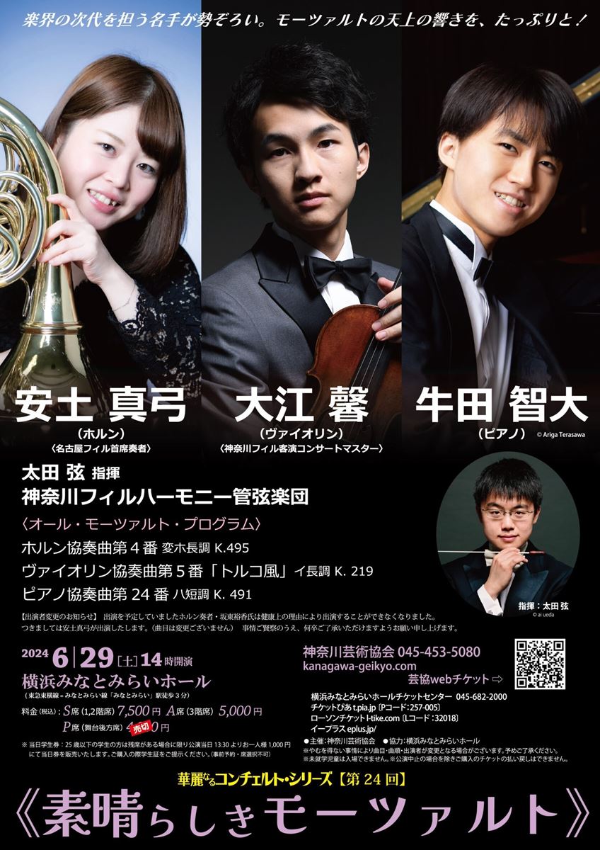 華麗なるコンチェルト・シリーズ 第24回 安土真弓/大江馨/牛田智大<素晴らしきモーツァルト> 24/6/29(土) 横浜みなとみらいホール 大ホール シェア ツイート 若き俊英たちが魅せる、華麗なるモーツァルトの世界 公演情報 ジャンル オーケストラ 未就学児童は入場不可。出演者・曲目は予定のため変更の可能性あり。他に4公演セット券あり、Pコード:781-028参照。 料金 S席(1・2階席)-7,500円 A席(3階席)-5,000円 P席(舞台後方席)-4,000円 表示できるチケット情報はありません詳しくはこちら キャスト&スタッフ ホルン 安土真弓 ヴァイオリン 大江馨 ピアノ 牛田智大 指揮 太田弦 管弦楽 神奈川フィルハーモニー管弦楽団 お問い合わせ 神奈川芸術協会 公式サイト シェア ツイート