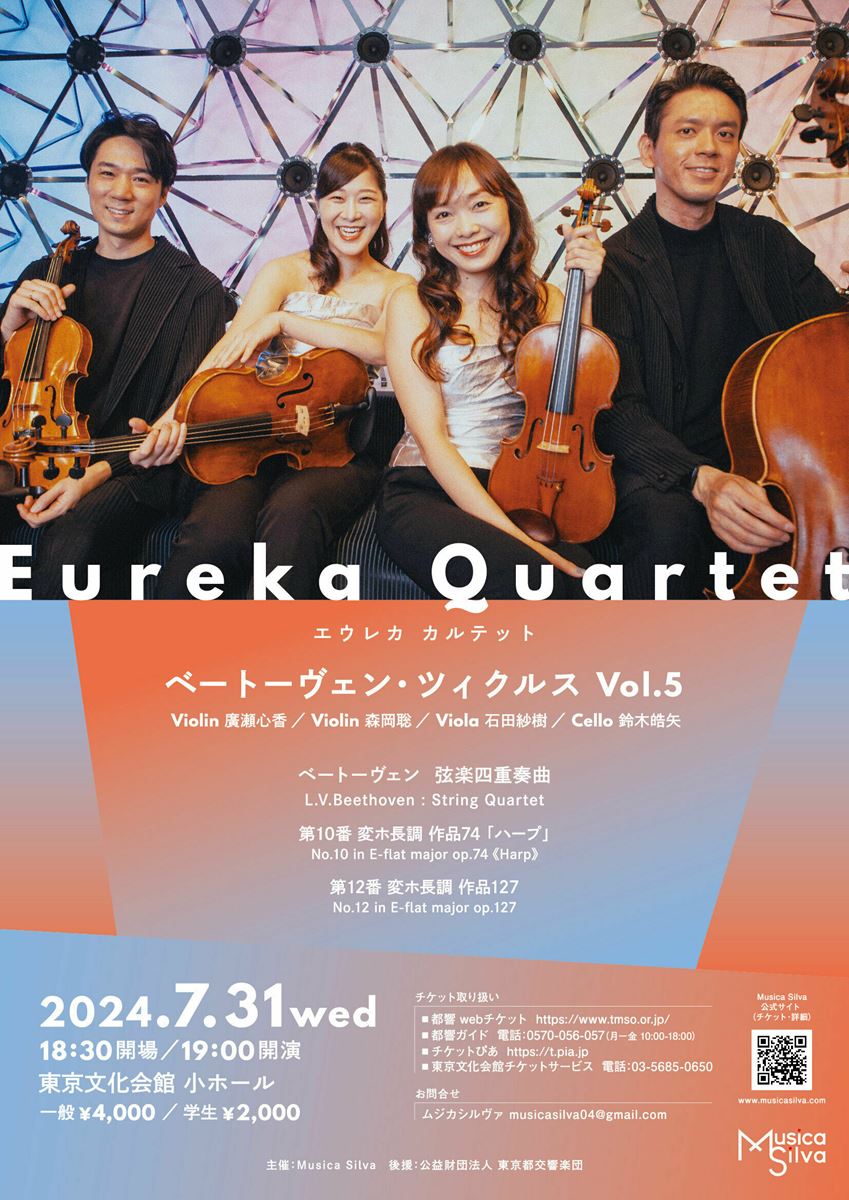 Eureka Quartetベートーヴェン・ツィクルスVol.5 24/7/31(水) 東京文化会館 小ホール シェア ツイート エウレカカルテットによるベートーヴェン弦楽四重奏曲全曲演奏会シリーズ第5弾! 公演情報 ジャンル 器楽 室内楽 未就学児童の入場はご遠慮下さい。 料金 全席自由 一般-4,000円 全席自由 学生-2,000円 表示できるチケット情報はありません詳しくはこちら キャスト&スタッフ 出演 廣瀬心香 森岡聡 石田紗樹 鈴木皓矢 お問い合わせ ムジカシルヴァ シェア ツイート
