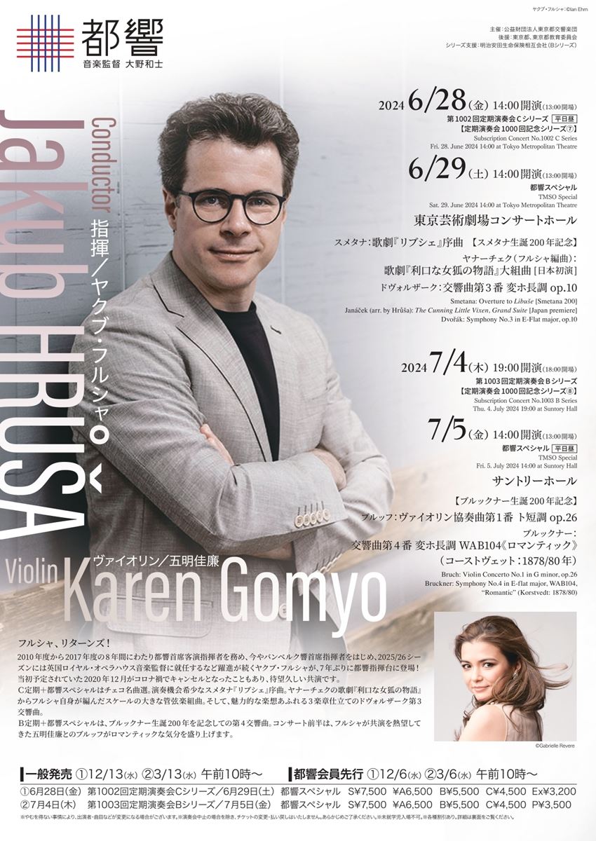 東京都交響楽団 第1003回定期演奏会Bシリーズ 24/7/4(木) サントリーホール 大ホール シェア ツイート ブルッフ:ヴァイオリン協奏曲第1番 ト短調 op.26/ブルックナー:交響曲第4番 変ホ長調 WAB104《ロマンティック》(コーストヴェット:1878/80年) 公演情報 ジャンル オーケストラ 未就学児童は入場不可。急遽出演者や曲目変更、または公演中止となる場合がございます。公演中止の場合を除き、払い戻しはいたしません。 料金 S席-7,500円 A席-6,500円 B席-5,500円 C席-4,500円 P席-3,500円 表示できるチケット情報はありません詳しくはこちら キャスト&スタッフ 指揮 ヤクブ・フルシャ 管弦楽 東京都交響楽団 ヴァイオリン 五明佳廉 お問い合わせ 都響ガイド 公式サイト シェア ツイート