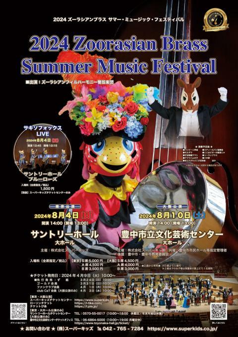 ズーラシアンブラス・サマー・ミュージック・フェスティバル東京公演 24/8/4(日) サントリーホール 大ホール シェア ツイート 公演情報 ジャンル オーケストラ ※0歳より入場可。3歳以上有料。2歳までは大人1名につき子ども1名膝上鑑賞無料。 料金 S席-5,000円 A席-4,500円 B席-3,500円 表示できるチケット情報はありません詳しくはこちら キャスト&スタッフ 出演 ズーラシアンフィルハーモニー管弦楽団 お問い合わせ (株)スーパーキッズ シェア ツイート