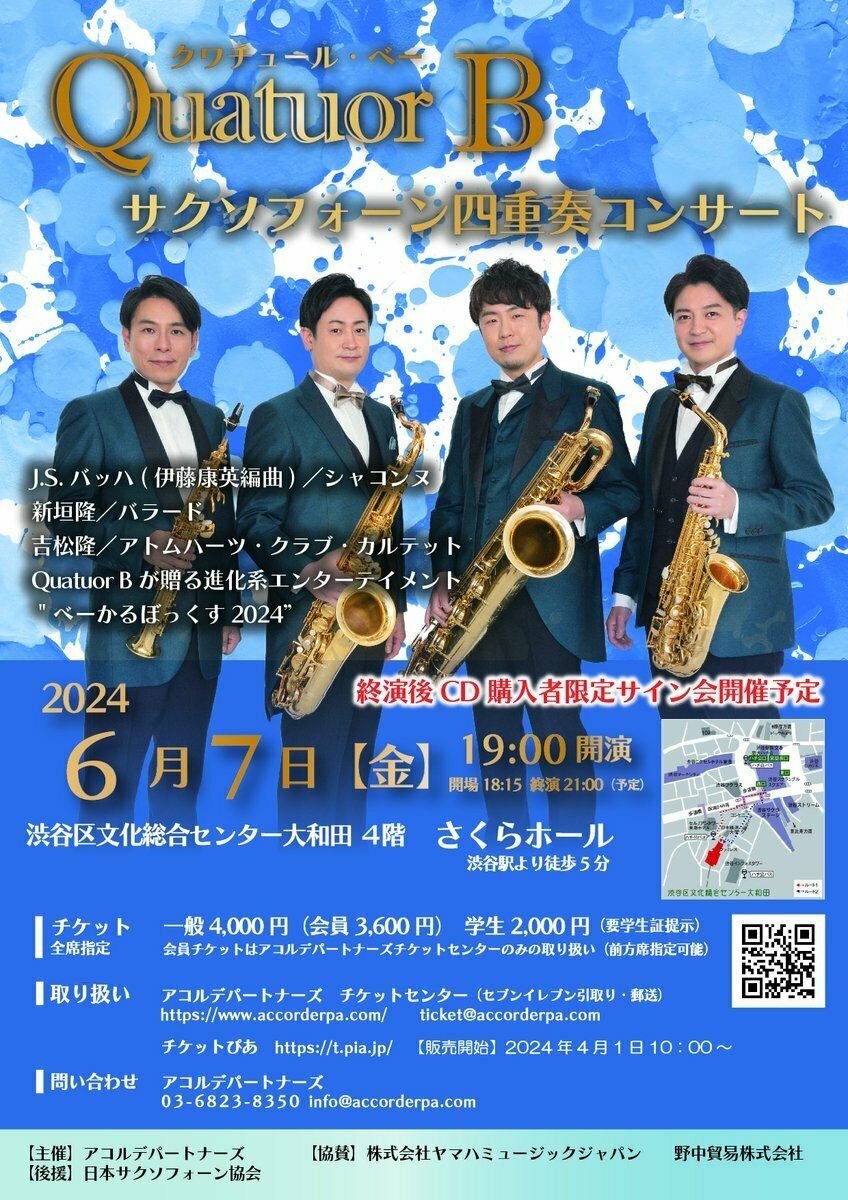 Quatuor B Concert 2024 24/6/7(金) 渋谷区文化総合センター大和田 さくらホール シェア ツイート サクソフォーン四重奏団QuatuorBがお送りする特別プログラムのリサイタル 公演情報 ジャンル 器楽 室内楽 未就学児入場不可 学生券は要学生証 転売不可 料金 全席指定 一般-4,000円 全席指定 学生-2,000円 表示できるチケット情報はありません詳しくはこちら キャスト&スタッフ 出演 Quatuor B 國末貞仁 山浦雅也 有村純親 小山弦太郎 お問い合わせ アコルデパートナーズ シェア ツイート