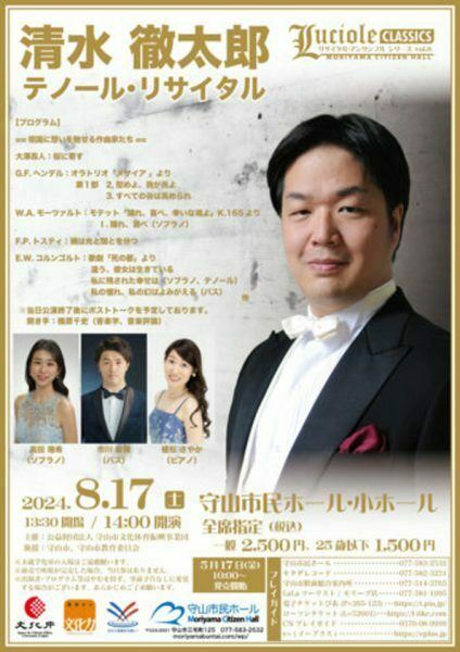 ルシオールクラシックス リサイタル・アンサンブルシリーズ 24/8/17(土) 守山市民ホール 小ホール シェア ツイート 清水徹太郎 テノール・リサイタル 公演情報 ジャンル 器楽 室内楽 未就学児童は入場不可。出演者・プログラム等はやむを得ず、事前予告なしに変更する場合がございます。予めご了承ください。駐車スペースは限られています。公共交通機関をご利用願います。 料金 一般-2,500円 25歳以下-1,500円 一般-指定 25歳以下-指定 表示できるチケット情報はありません詳しくはこちら キャスト&スタッフ 出演 清水徹太郎 高田瑞希 市川敏雅 植松さやか お問い合わせ 守山市民ホール シェア ツイート