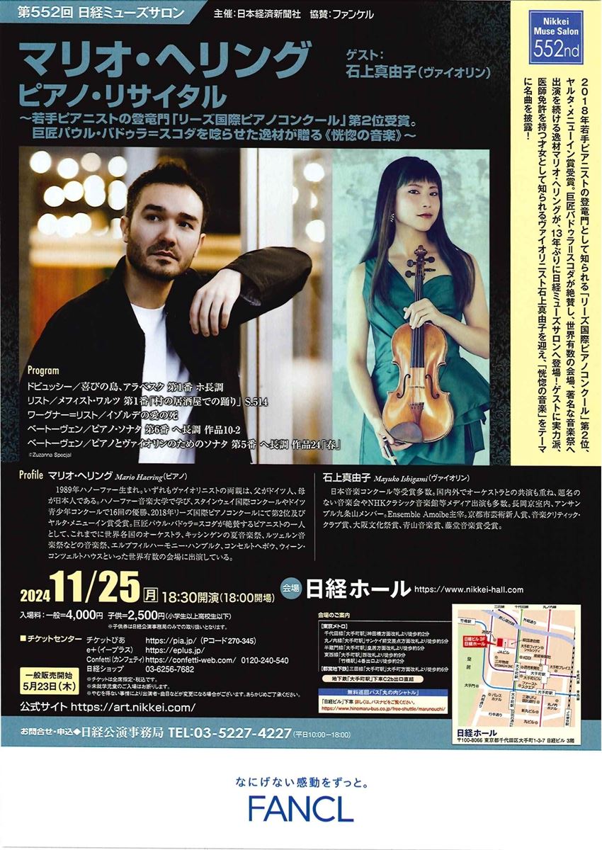 マリオ・ヘリング ピアノ・リサイタル 24/11/25(月) 日経ホール シェア ツイート ~若手ピアニストの登竜門「リーズ国際ピアノコンクール」第2位受賞。巨匠パウル・バドゥラ=スコダを唸らせた逸材が贈る《恍惚の音楽》~ 公演情報 ジャンル ピアノ・鍵盤楽器 未就学児童入場不可。 料金 一般-4,000円 表示できるチケット情報はありません詳しくはこちら キャスト&スタッフ 出演 マリオ・ヘリング ゲスト 石上真由子 お問い合わせ 日経公演事務局 公式サイト シェア ツイート