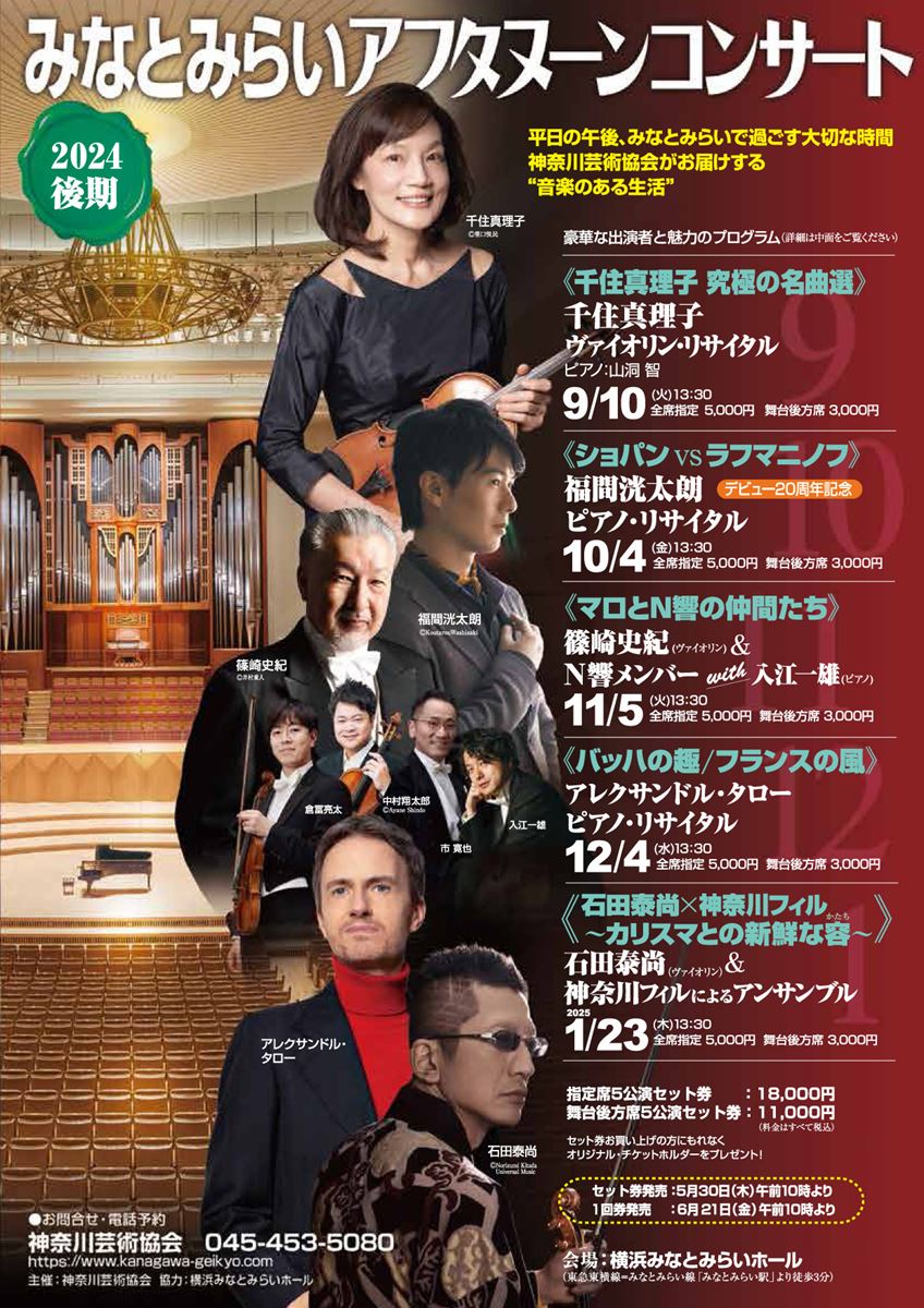 千住真理子ヴァイオリン・リサイタル 24/9/10(火) 横浜みなとみらいホール 大ホール シェア ツイート 《千住真理子 究極の名曲選》大人気ヴァイオリニストによる、究極の名曲選!世界で愛される名旋律を堪能する 公演情報 ジャンル 器楽 未就学児童は入場不可。出演者・曲目は予定のため変更の可能性あり。他に5公演セット券あり、Pコード:781-255参照。 料金 全席指定-5,000円 舞台後方席-3,000円 表示できるチケット情報はありません詳しくはこちら キャスト&スタッフ ヴァイオリン 千住真理子 ピアノ 山洞智 お問い合わせ 神奈川芸術協会 公式サイト シェア ツイート