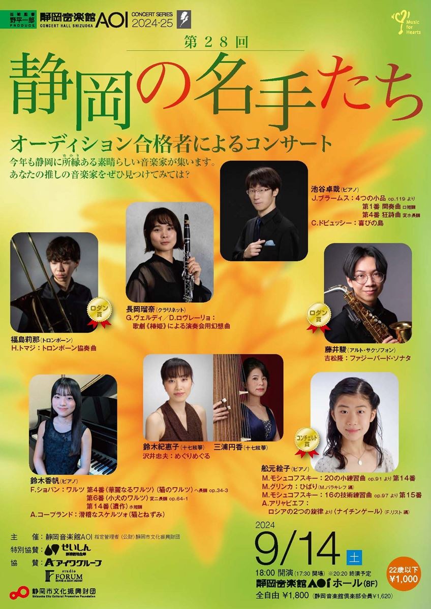 第28回「静岡の名手たち」オーディション合格者によるコンサート 24/9/14(土) 静岡音楽館AOI シェア ツイート 公演情報 ジャンル 器楽 ピアノ・鍵盤楽器 22歳以下券あり。但し、ぴあでの取扱いなし。詳細は問合せ先まで。未就学児童は入場不可。 料金 全自由-1,800円 表示できるチケット情報はありません詳しくはこちら お問い合わせ 静岡音楽館AOI シェア ツイート