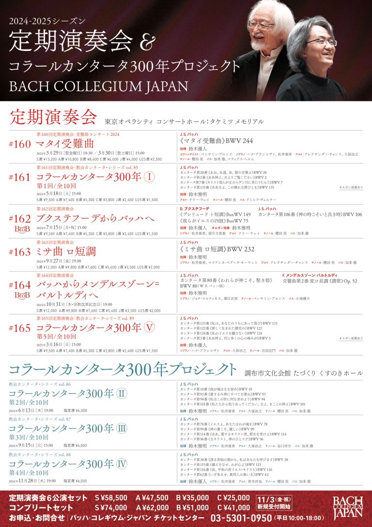バッハ・コレギウム・ジャパン 第163回定期演奏会 24/9/27(金) 東京オペラシティ コンサートホール:タケミツメモリアル シェア ツイート J. S. バッハ:《ミサ曲 ロ短調》BWV 232 公演情報 ジャンル 声楽 未就学児童は入場不可。 料金 S席-12,000円 A席-9,800円 B席-7,600円 C席-5,400円 J席-3,500円 表示できるチケット情報はありません詳しくはこちら キャスト&スタッフ 指揮 鈴木雅明 出演 松井亜希 マリアンネ・ベアーテ・キーラント アレクサンダー・チャンス 櫻田亮 加耒徹 合唱・管弦楽 バッハ・コレギウム・ジャパン お問い合わせ バッハ・コレギウム・ジャパン 公式サイト シェア ツイート