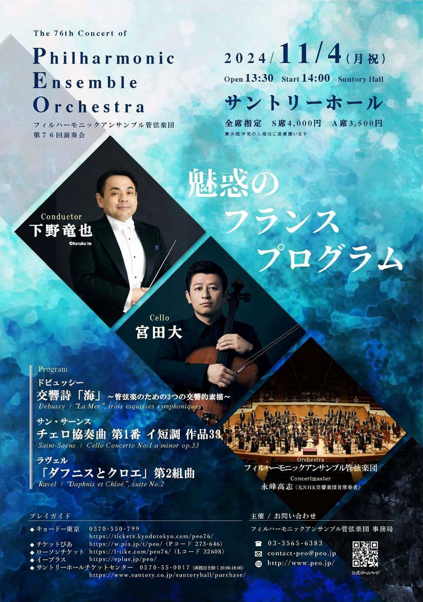フィルハーモニックアンサンブル管弦楽団 24/11/4(月) サントリーホール 大ホール シェア ツイート 公演情報 ジャンル オーケストラ 未就学児の入場はご遠慮願います。 料金 S席-4,000円 A席-3,500円 表示できるチケット情報はありません詳しくはこちら キャスト&スタッフ 指揮 下野竜也 管弦楽 フィルハーモニックアンサンブル管弦楽団 チェロ 宮田大 コンサートマスター 永峰高志 お問い合わせ PEO事務局 シェア ツイート