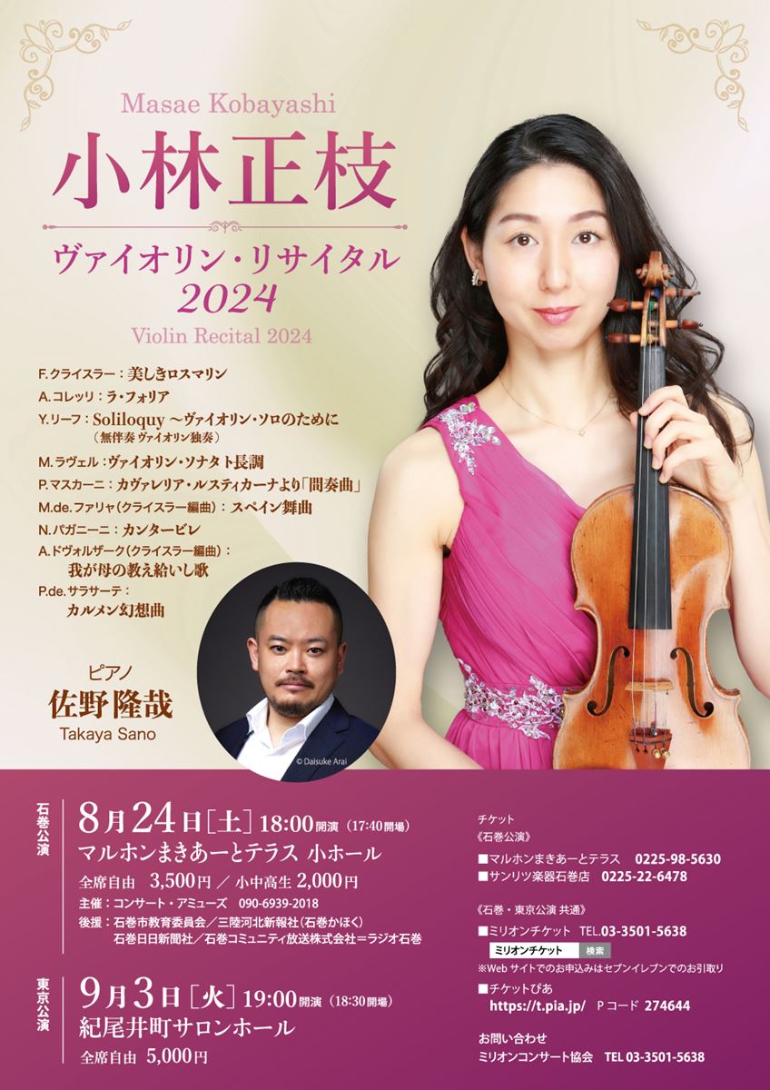 小林正枝ヴァイオリンリサイタル2024 24/8/24(土)~24/9/3(火) マルホンまきあーとテラス 小ホール、紀尾井町サロンホール シェア ツイート 公演情報 ジャンル 器楽 料金 全席自由-3,500円 全席自由-5,000円 表示できるチケット情報はありません詳しくはこちら キャスト&スタッフ 出演 小林正枝 佐野隆哉 お問い合わせ (株)ミリオンコンサート協会 シェア ツイート