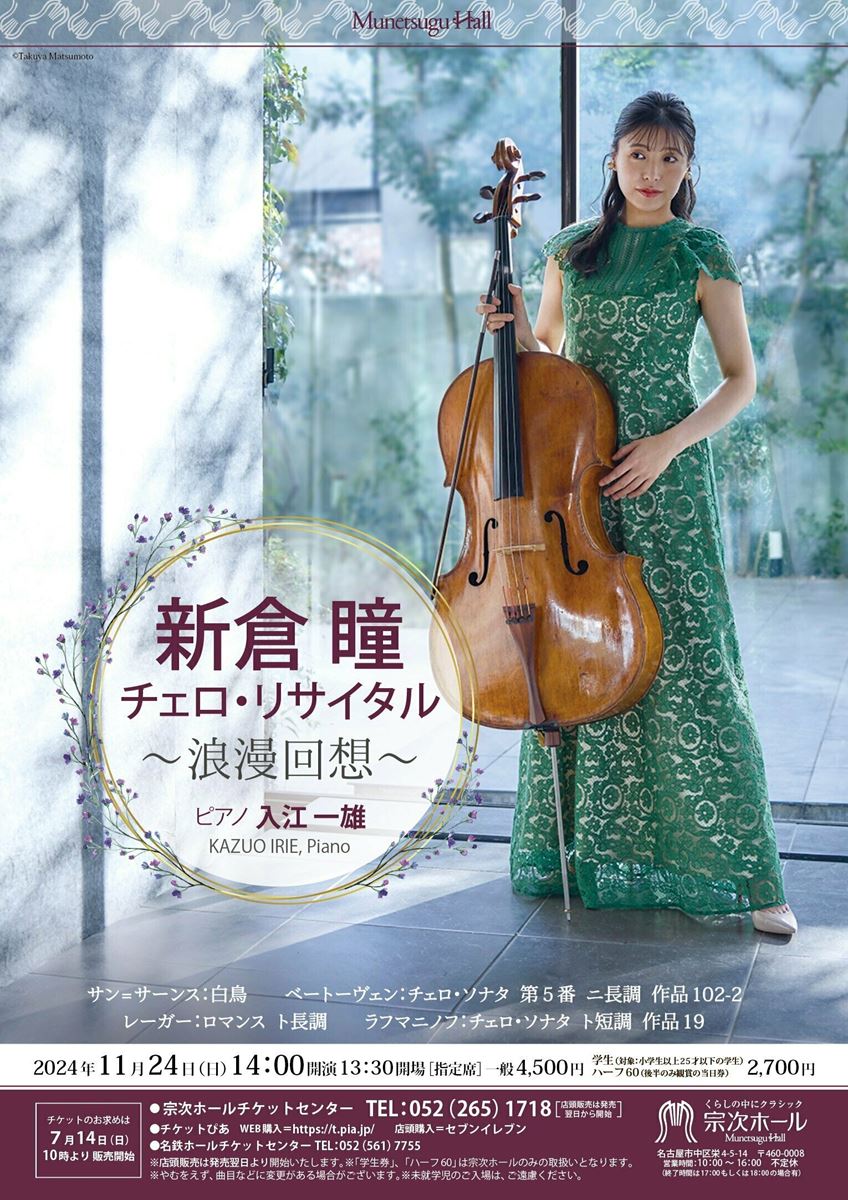 学生券・セット券・プレミアムシートは、宗次ホールチケットセンターでのみ販売いたします。未就学児童は入場不可。公演開催についての最新情報は宗次ホールホームページまたは問合せ先までご確認ください。感染対策/座席定員/中止・振替等についてhttps://munetsuguhall.com/news/ 入場整理番号についてhttps://munetsuguhall.com/news/general/entry-2478.html ご確認の上、ご来場いただきますようお願い致します。