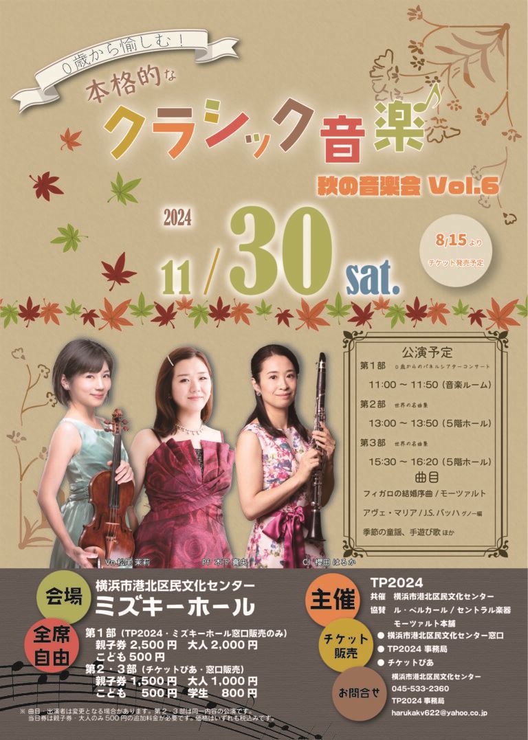 0歳から愉しむ!本格的なクラシック音楽♪ 秋の音楽会Vol.6 24/11/30(土) 横浜市港北区民文化センター ミズキーホール シェア ツイート 0歳から本格的なクラシック音楽に触れよう! 公演情報 ジャンル 器楽 室内楽 0歳からチケット購入が必要です。ベビーカーは客席内にお持ち込み頂けません。こども対象年齢は0歳から小学生以下。2回とも曲目は同じですので、重複購入にご注意ください。 料金 自由席:親子券(大人子供各1名)-1,500円 自由席:大人-1,000円 自由席:こども(小学生以下)-500円 学生(中・高・大学生)-800円 表示できるチケット情報はありません詳しくはこちら キャスト&スタッフ 出演 櫻田はるか 松尾茉莉 木下真央 お問い合わせ 港北区民文化センターミズキーホール 公式サイト シェア ツイート