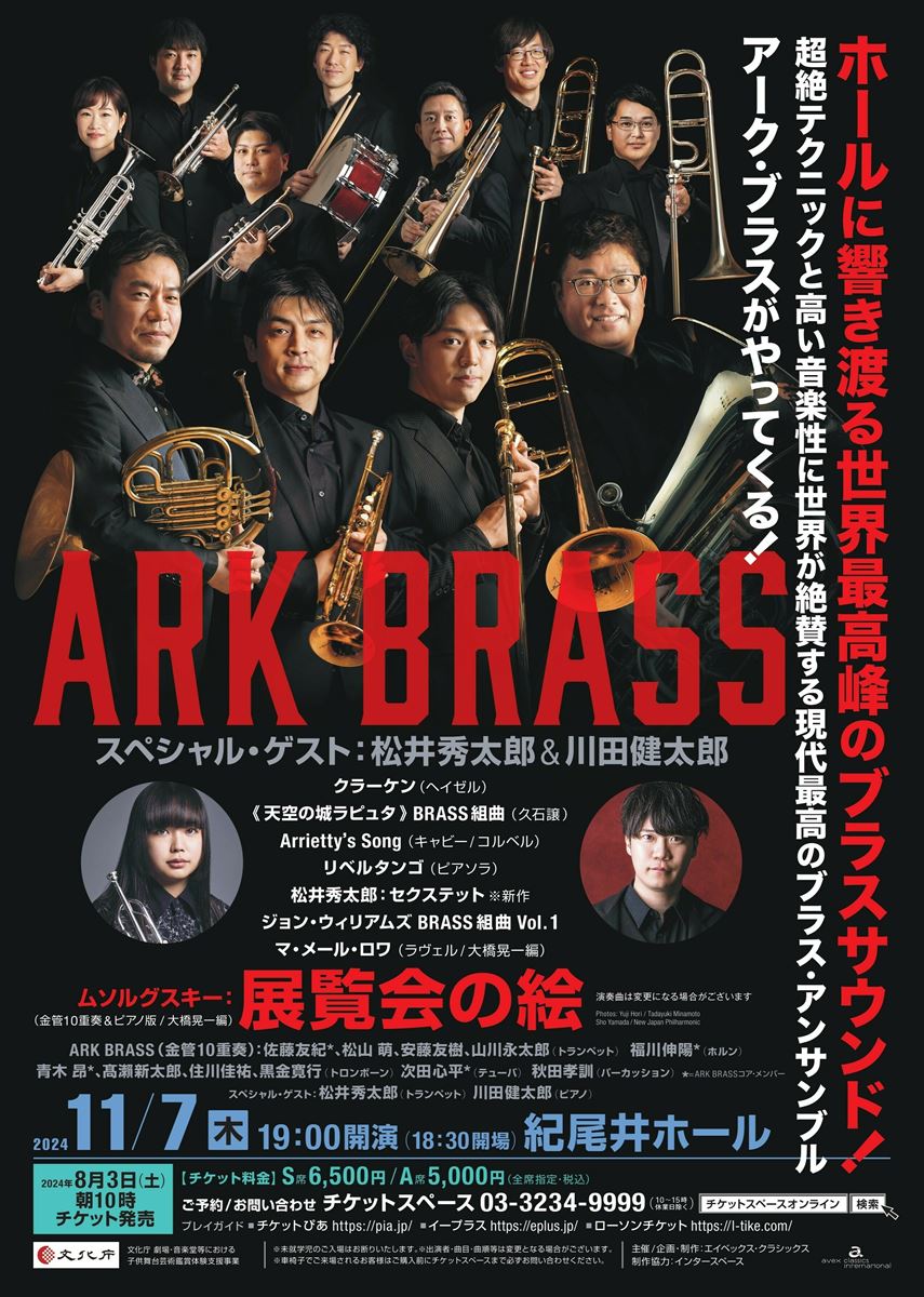 ARK BRASS 24/11/7(木) 紀尾井ホール シェア ツイート ホールに響き渡る世界最高峰のブラスサウンドに圧倒される!超絶テクニックと高い音楽性に世界が絶賛する現代最高のブラス・アンサンブルがやってくる! 公演情報 ジャンル 器楽 室内楽 未就学児のご入場はお断りいたします。出演者・曲目・曲順等は変更となる場合がございます。車椅子でご来場されるお客様はご購入前にチケットスペースまで必ずお問い合わせください。 料金 S席-6,500円 A席-5,000円 表示できるチケット情報はありません詳しくはこちら キャスト&スタッフ 出演 ARK BRASS ゲスト 松井秀太郎 川田健太郎 お問い合わせ チケットスペース 公式サイト シェア ツイート