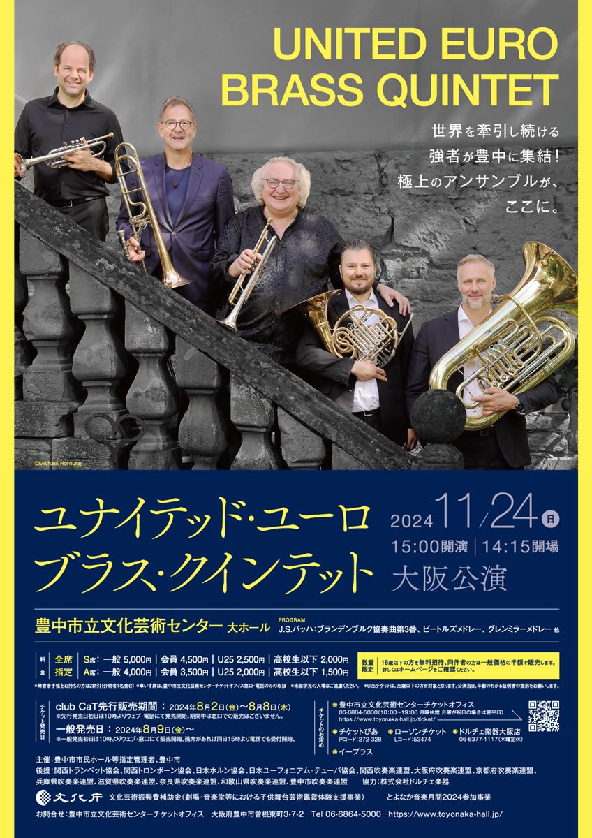 ユナイテッド・ユーロ ブラス・クインテット 大阪公演 24/11/24(日) 豊中市立文化芸術センター 大ホール シェア ツイート 世界を牽引し続ける強者が集結! 極上のアンサンブルが、ここに。 公演情報 ジャンル 器楽 室内楽 未就学児童は入場不可。 料金 S席 一般-5,000円 S席 高校生以下-2,000円 A席 一般-4,000円 A席 高校生以下-1,500円 S席 高校生以下-要学生証 A席 高校生以下-要学生証 表示できるチケット情報はありません詳しくはこちら キャスト&スタッフ 出演 ユナイテッド・ユーロ・ブラス・クインテット お問い合わせ 豊中市立文化芸術センターチケットオフィス 10:00~19:00 月曜休館 公式サイト シェア ツイート