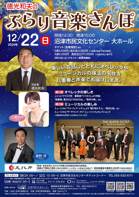 徳光和夫のぶらり音楽さんぽ 24/12/22(日) 沼津市民文化センター 大ホール シェア ツイート 日本を代表するアナウンサー「徳光和夫」がオペレッタやミュージカルの珠玉の名曲をわかりやすくご案内する音楽さんぽ。 公演情報 ジャンル 声楽 室内楽 未就学児童は入場不可。 料金 S席-4,000円 S席高校生以下-1,000円 A席-2,000円 A席高校生以下-1,000円 表示できるチケット情報はありません詳しくはこちら キャスト&スタッフ 出演 徳光和夫 ザ・スーパーオクテット 工藤志州 星野淳 お問い合わせ 沼津市民文化センター シェア ツイート
