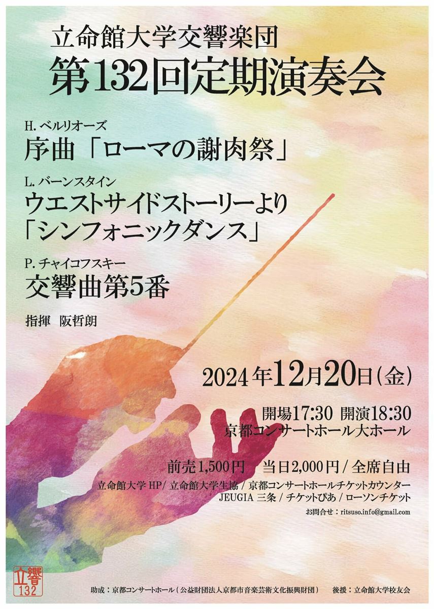 立命館大学交響楽団第132回定期演奏会 24/12/20(金) 京都コンサートホール 大ホール シェア ツイート 公演情報 ジャンル オーケストラ 未就学児入場不可。公式HPにて詳細の注意事項をご確認ください。 料金 前売り-1,500円 表示できるチケット情報はありません詳しくはこちら キャスト&スタッフ 指揮 阪哲朗 管弦楽 立命館大学交響楽団 お問い合わせ 立命館大学交響楽団 広報部 川瀬玲音 公式サイト シェア ツイート