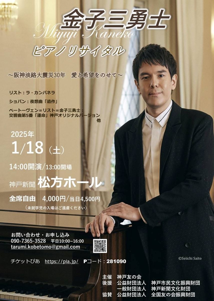 金子三勇士ピアノリサイタル 25/1/18(土) 神戸新聞松方ホール シェア ツイート 金子三勇士ピアノリサイタル ~阪神淡路大震災30年 愛と希望をのせて~ 公演情報 ジャンル ピアノ・鍵盤楽器 未就学児の入場はご遠慮ください 料金 全席自由-4,000円 表示できるチケット情報はありません詳しくはこちら お問い合わせ 神戸友の会 シェア ツイート