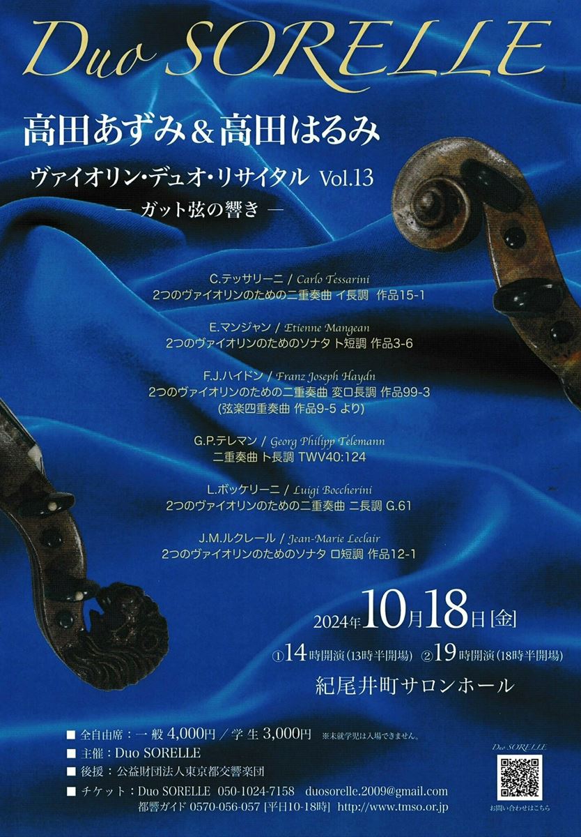 Duo SORELLE 高田あずみ&高田はるみ ヴァイオリン・デュオ・リサイタルVol.13 24/10/18(金) 紀尾井町サロンホール シェア ツイート -ガット弦の響き- 公演情報 ジャンル 器楽 料金 全席自由一般-4,000円学生-3,000円※未就学児入場不可 お問い合わせ Duo Sorelle 公式サイト シェア ツイート