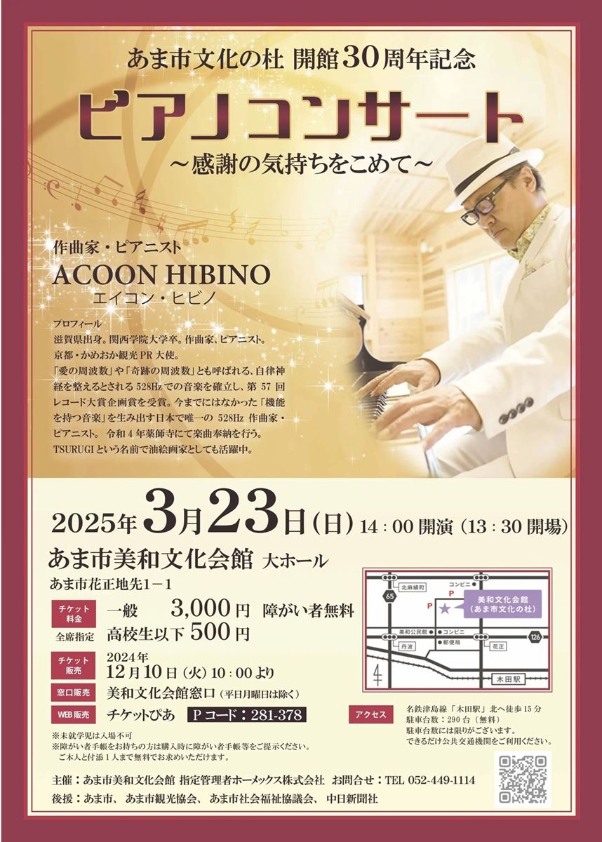 ACOON HIBINO ピアノコンサート 25/3/23(日) あま市美和文化会館 シェア ツイート 公演情報 ジャンル ピアノ・鍵盤楽器 ※未就学児入場不可 料金 一般-3,000円 高校生以下-500円 表示できるチケット情報はありません詳しくはこちら キャスト&スタッフ 出演 ACOON HIBINO お問い合わせ あま市美和文化会館 シェア ツイート