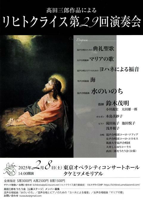 高田三郎作品による第29回リヒトクライス演奏会 25/2/8(土) 東京オペラシティ コンサートホール:タケミツメモリアル シェア ツイート すべて高田三郎の作品のみで構成される演奏会です。 公演情報 ジャンル 声楽 未就学児童は入場不可。 料金 S席-3,000円 A席-2,500円 B席-1,500円 表示できるチケット情報はありません詳しくはこちら キャスト&スタッフ 出演 鈴木茂明 木島美紗子 滝田祐子 池田悦子 浅井桜子 混声合唱団コーロ・ソフィア 女声合唱団コーロ・コスモス 筑波大学混声合唱団 大井しらゆりコーラス お問い合わせ リヒトクライス実行委員会 シェア ツイート