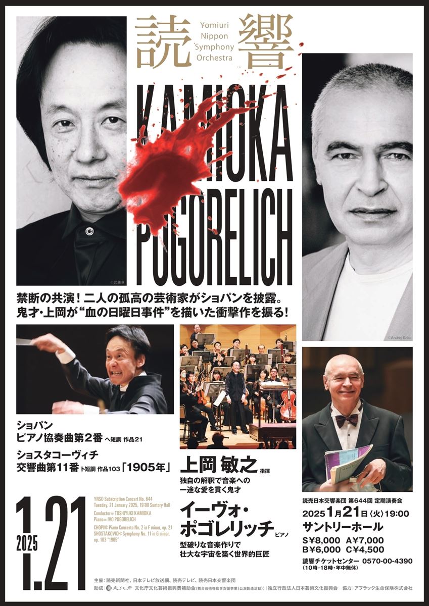 読売日本交響楽団 第644回定期演奏会 25/1/21(火) サントリーホール 大ホール シェア ツイート ショパン:ピアノ協奏曲第2番 ヘ短調 作品21/ショスタコーヴィチ:交響曲第11番 ト短調 作品103 「1905年」 公演情報 ジャンル オーケストラ 料金 S-8,000円A-7,000円B-6,000円C-4,500円 表示できるチケット情報はありません詳しくはこちら キャスト&スタッフ 指揮 上岡敏之 管弦楽 読売日本交響楽団 ピアノ イーヴォ・ポゴレリッチ お問い合わせ 読響チケットセンター 公式サイト シェア ツイート