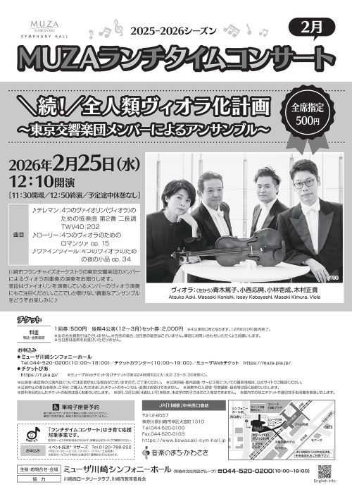 MUZAランチタイムコンサート2月 \続!/全人類ヴィオラ化計画 ~東京交響楽団メンバーによるアンサンブル~ 26/2/25(水) ミューザ川崎シンフォニーホール シェア ツイート テレマン:4つのヴァイオリン(ヴィオラ)のための協奏曲 第2番 二長調 TWV40:202/ローリー:4つのヴィオラのためのロマンツァ op. 15/ヴァインツィール:4つのヴィオラのための夜の小品 op. 34 公演情報 ジャンル 器楽 室内楽 未就学児童は入場不可。車椅子席は問合せ先まで。 料金 全席指定-500円 表示できるチケット情報はありません詳しくはこちら キャスト&スタッフ 出演 小林壱成 青木篤子 小西応興 木村正貴 お問い合わせ ミューザ川崎シンフォニーホール 公式サイト シェア ツイート