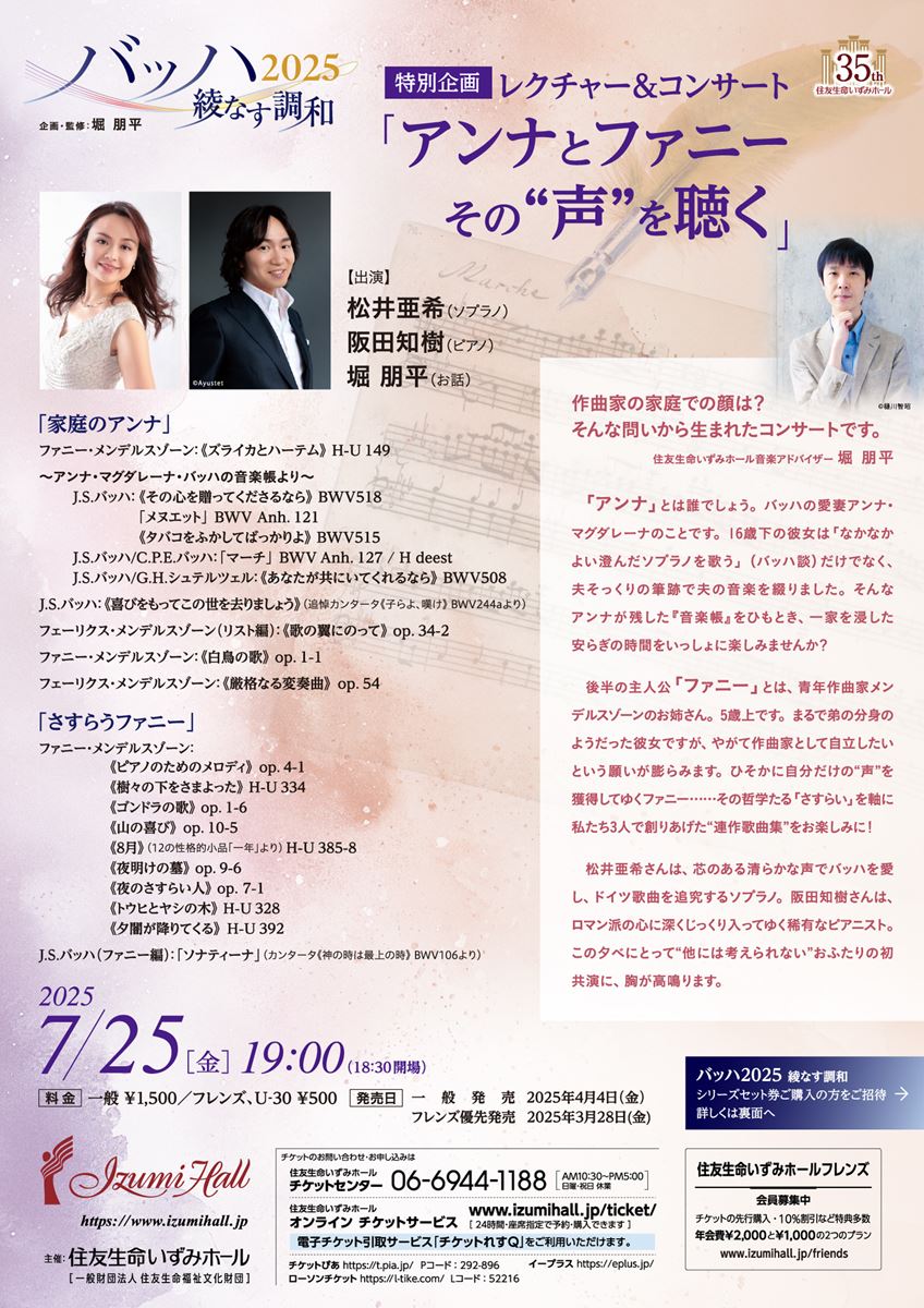 バッハ2025 綾なす調和 特別企画 レクチャー&コンサート 「アンナとファニー その"声"を聴く」 25/7/25(金) 住友生命いずみホール シェア ツイート 作曲家の家庭での顔は?そんな問いから生まれたコンサートです。 公演情報 ジャンル その他 ピアノ・鍵盤楽器 声楽 U-30、ユースシートは取り扱いなし。未就学児童は入場不可。 料金 一般-1,500円 一般-指定 表示できるチケット情報はありません詳しくはこちら キャスト&スタッフ 出演 松井亜希 阪田知樹 堀朋平 お問い合わせ いずみホールチケットセンター 公式サイト シェア ツイート