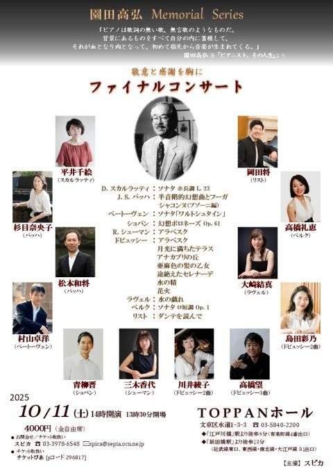 園田高弘Memorial Series 「ファイナルコンサート」 25/10/11(土) TOPPANホール シェア ツイート すべての写真(2)を見る 日本の音楽界に大きな足跡を残した園田高弘氏から薫陶を受けた気鋭のピアニスト12人が感謝と敬意を込めて すべての写真(2)を見る 公演情報 ジャンル ピアノ・鍵盤楽器 料金 全席自由-4,000円 表示できるチケット情報はありません詳しくはこちら キャスト&スタッフ 出演 青柳晋 大崎結真 岡田将 川井綾子 島田彩乃 杉目奈央子 高橋望 高橋礼恵 平井千絵 松本和将 三木香代 村山卓洋 お問い合わせ スピカ シェア ツイート