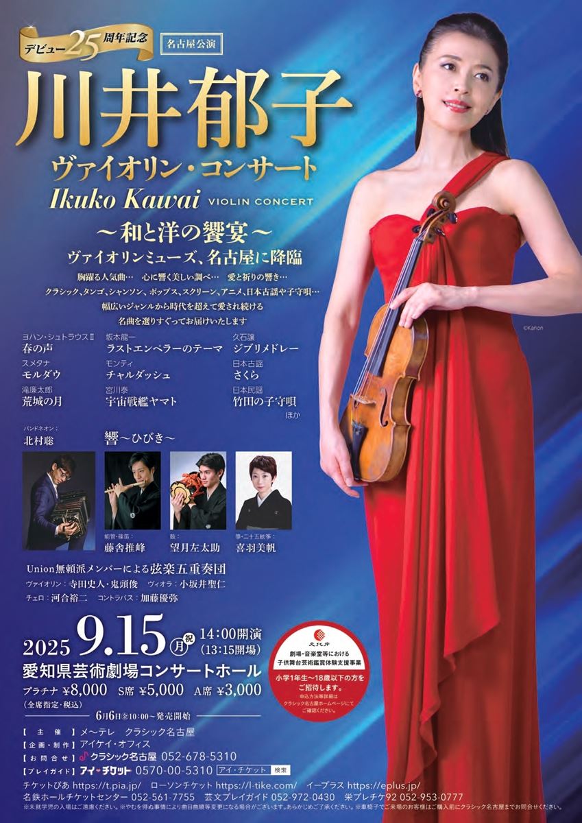 川井郁子 ヴァイオリン・コンサート 名古屋公演 25/9/15(月) 愛知県芸術劇場 コンサートホール シェア ツイート すべての写真(2)を見る デビュー25周年記念 すべての写真(2)を見る 公演情報 ジャンル 器楽 室内楽 未就学児の入場はご遠慮ください。やむを得ない事情により曲目曲順等が変更となる場合がございます。あらかじめご了承ください。車椅子でご来場のお客様はご購入前にクラシック名古屋までお問合せください。 料金 プラチナ-8,000円 S席-5,000円 A席-3,000円 表示できるチケット情報はありません詳しくはこちら キャスト&スタッフ 出演 川井郁子 共演 北村聡 藤舎推峰 望月左太助 喜羽美帆 Union無頼派メンバーによる弦楽五重奏団 お問い合わせ クラシック名古屋 シェア ツイート
