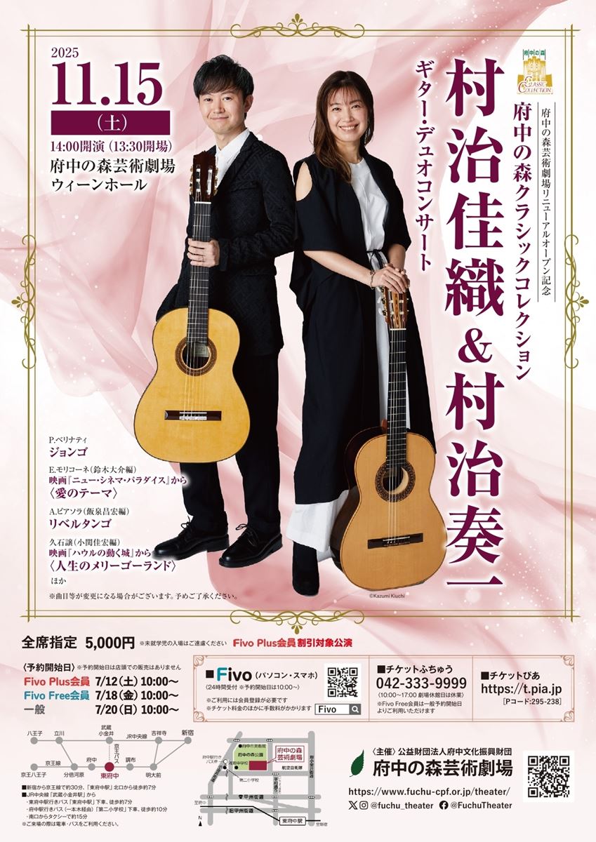 村治佳織&村治奏一 ギター・デュオコンサート 25/11/15(土) 府中の森芸術劇場 ウィーンホール シェア ツイート すべての写真(2)を見る 府中の森芸術劇場リニューアルオープン記念 府中の森クラシックコレクション すべての写真(2)を見る 公演情報 ジャンル 器楽 室内楽 未就学児童は入場不可。車椅子席は問合せ先まで。 料金 全席指定-5,000円 表示できるチケット情報はありません詳しくはこちら キャスト&スタッフ ギター 村治佳織 村治奏一 お問い合わせ チケットふちゅう予約センター 公式サイト シェア ツイート