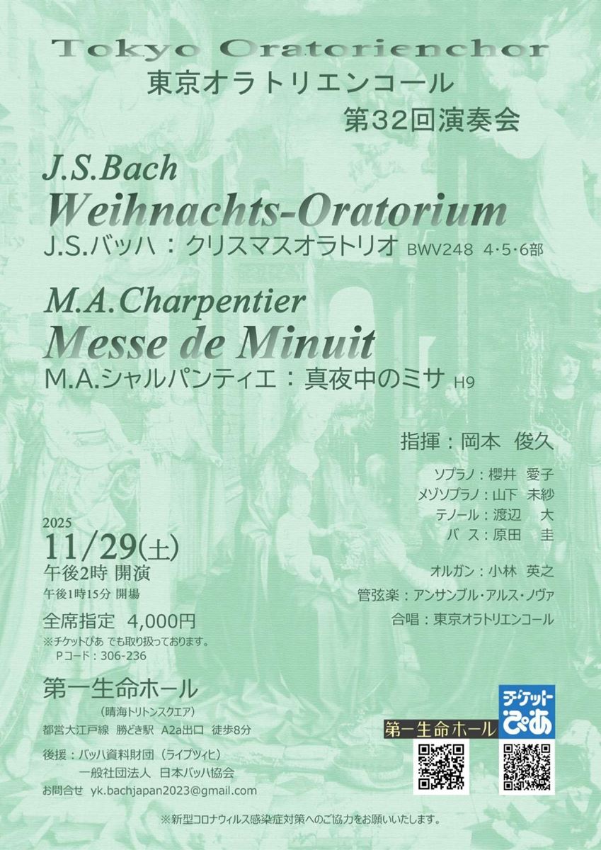 東京オラトリエンコール 第32回 演奏会 25/11/29(土) 第一生命ホール シェア ツイート すべての写真(2)を見る すべての写真(2)を見る 公演情報 ジャンル 声楽 料金 指定席-4,000円 表示できるチケット情報はありません詳しくはこちら キャスト&スタッフ 出演 東京オラトリエンコール 指揮 岡本俊久 演奏 アンサンブル・アルス・ノヴァ 小林英之 ソプラノ 櫻井愛子 メゾソプラノ 山下未紗 テノール 渡辺大 バス 原田圭 お問い合わせ 高羽 公式サイト シェア ツイート