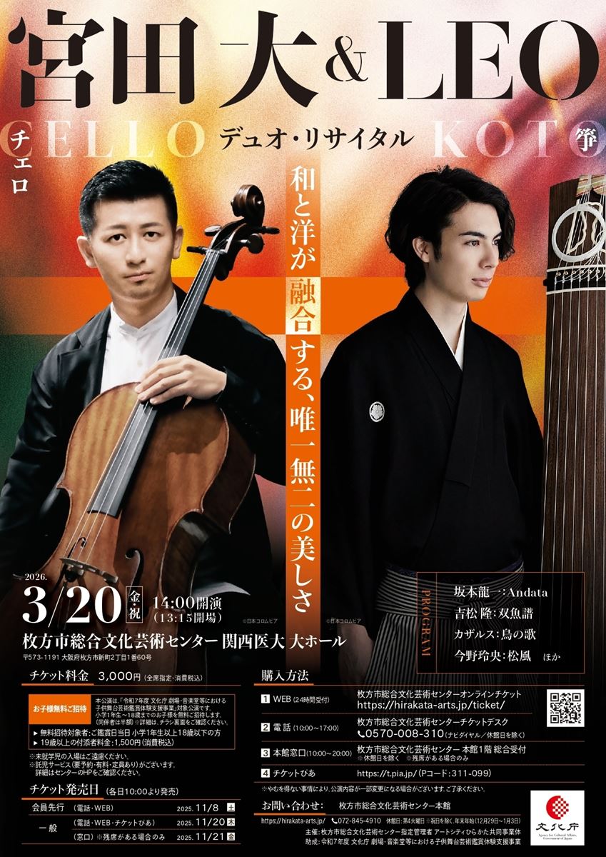 日本を代表するチェロ奏者・宮田 大と、邦楽界の新星筝奏者・LEOによるスペシャルデュオ公演。圧倒的な音楽性と感性が響きあうステージが枚方に初登場!